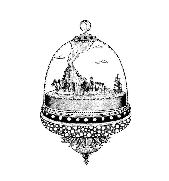 Ce qui intéresse Sailor Roman, illustrateur et tatoueur ? Le parcours des gens, leur cheminement, leur histoire. Ainsi, il utilise par exemple le globe, élément récurrent de son travail, pour conter la vie de ses clients comme un aide mémoire illustré. L’île, enfermée dans le verre, évoque les récits de voyages de Jack London, une grande source d’inspiration pour Sailor. C’est aussi la réminiscence d’un voyage qui l’a emmené le long des côtes de l’île de Montserrat, “l’île d'émeraude des Caraïbes“, surmontée d’un volcan encore actif…