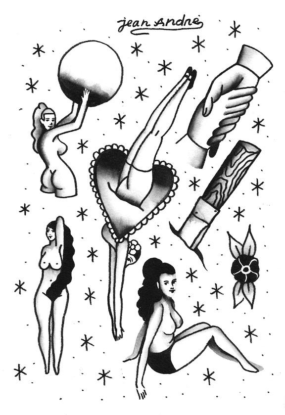 Les caractéristiques de son travail ? ”Une pointe d’humour et pas mal de glamour, des smileys et globalement beaucoup de femmes.” Jean André range volontiers ses dessins dans un genre de « gentleman art » à mi-chemin entre les illustrations de charme et la simple célébration de la beauté des dames. Il n’est donc pas étonnant de retrouver parmi ses influences une des têtes d’affiche du pop art, Tom Wesselmann, le facétieux Jean Paul Goude ou le photographe Richard Kern. Mais pas que. Jean André s’inspire également des univers foisonnants de Matisse et de Dali et, de manière générale, de tous “les artisans de l’image qui ne se limitent pas à des techniques ou des outils à la mode". Jean André aime sentir l’image dans ses mains, dessiner avec de “vrais outils“, comme l’encre de chine “qui offre une profondeur incomparable et des milliers de rendus différents selon l’outil utilisé.”